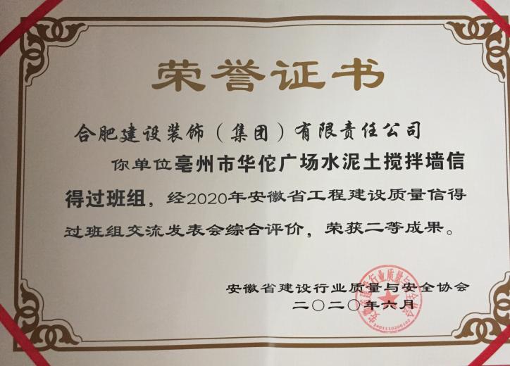 亳州华佗广场基础工程QC小组《提高水泥土搅拌墙成墙质量验收合格率》成果荣获2020年安徽省工程建设质量管理小组成果一等奖