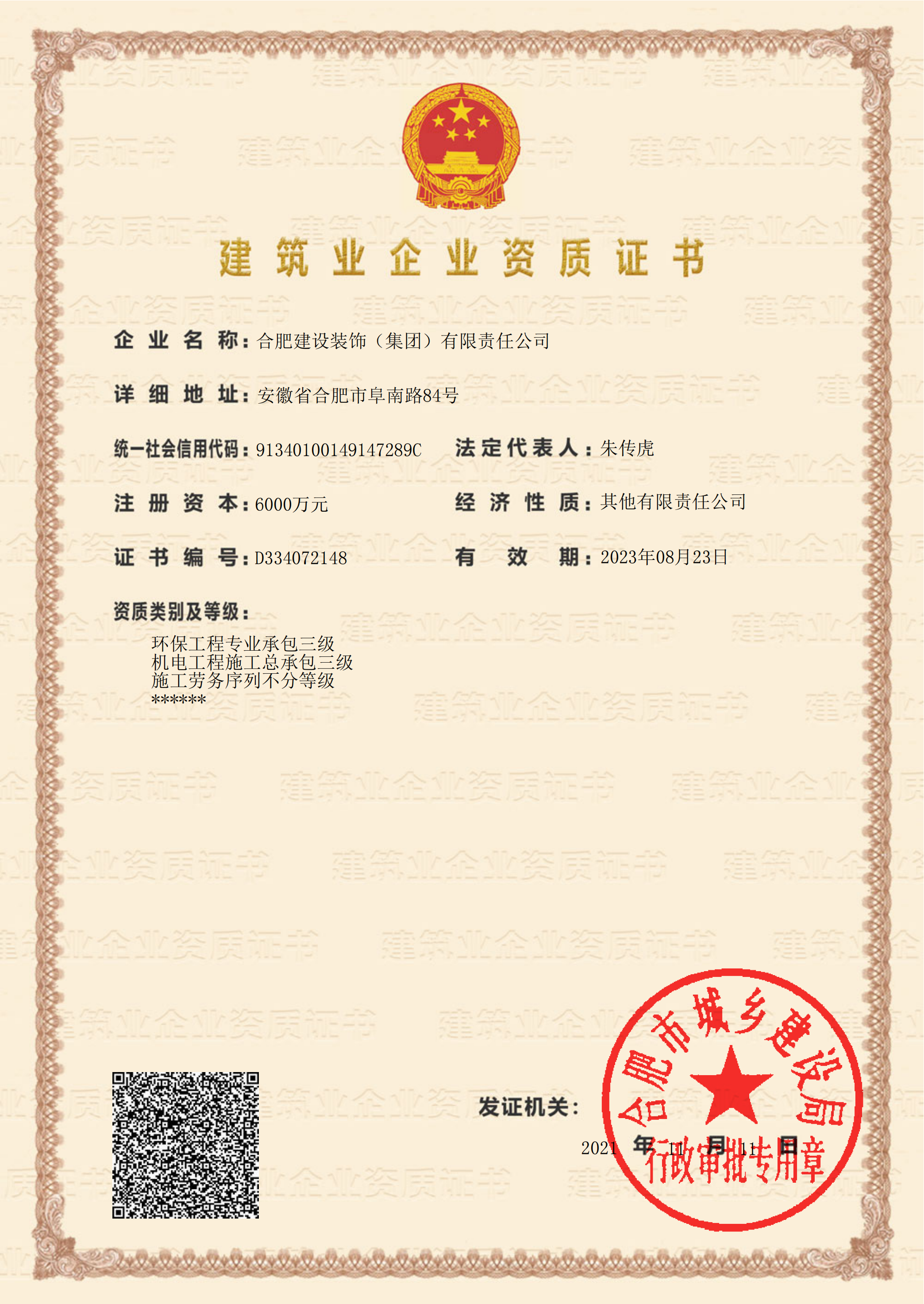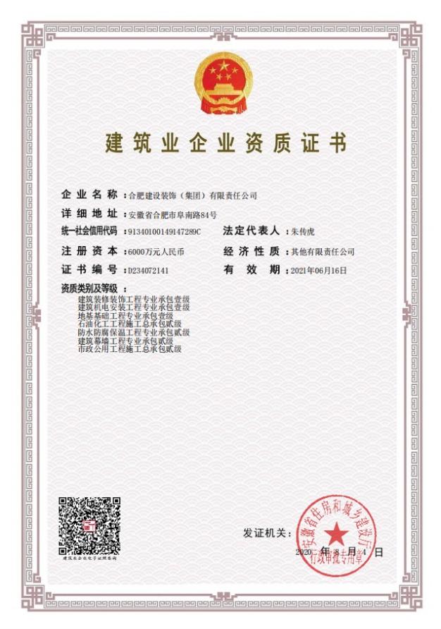 建筑工程施工总承包一级/市政公用工程施工总承包壹级/地基基础工程专业承包壹级/防水防腐保温工程专业承包壹级/建筑装修装饰工程专业承包壹级资质