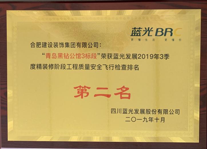 青岛黑钻公馆3标段荣获蓝光发展2019年3季度精装修阶段工程质量安全飞行检查排名第二名
