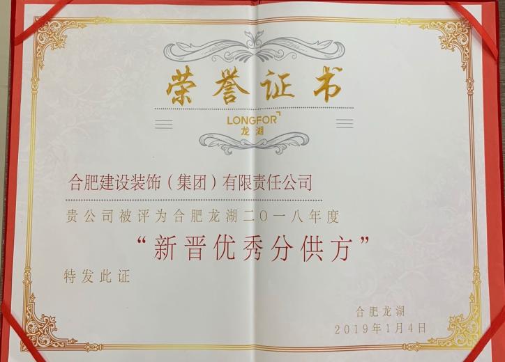 被评为合肥龙湖2018年度“新晋优秀分供方