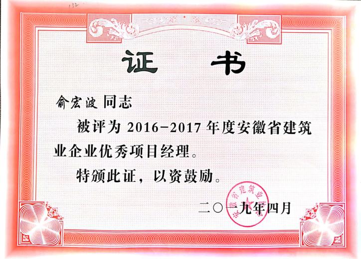 >2016-2017年安徽省建筑业优秀项目经理——俞宏波