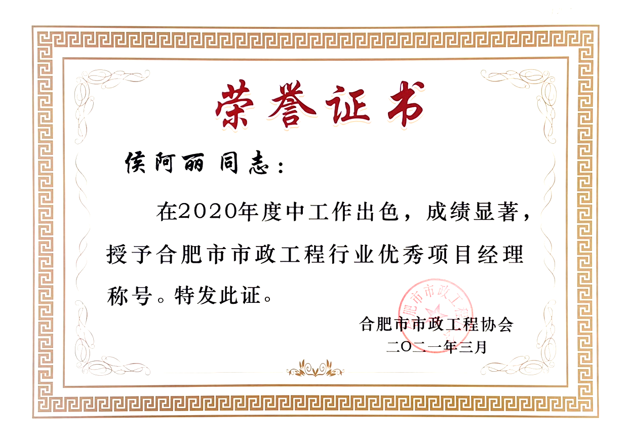 2020年度合肥市市政工程行业优秀项目经理——侯阿丽