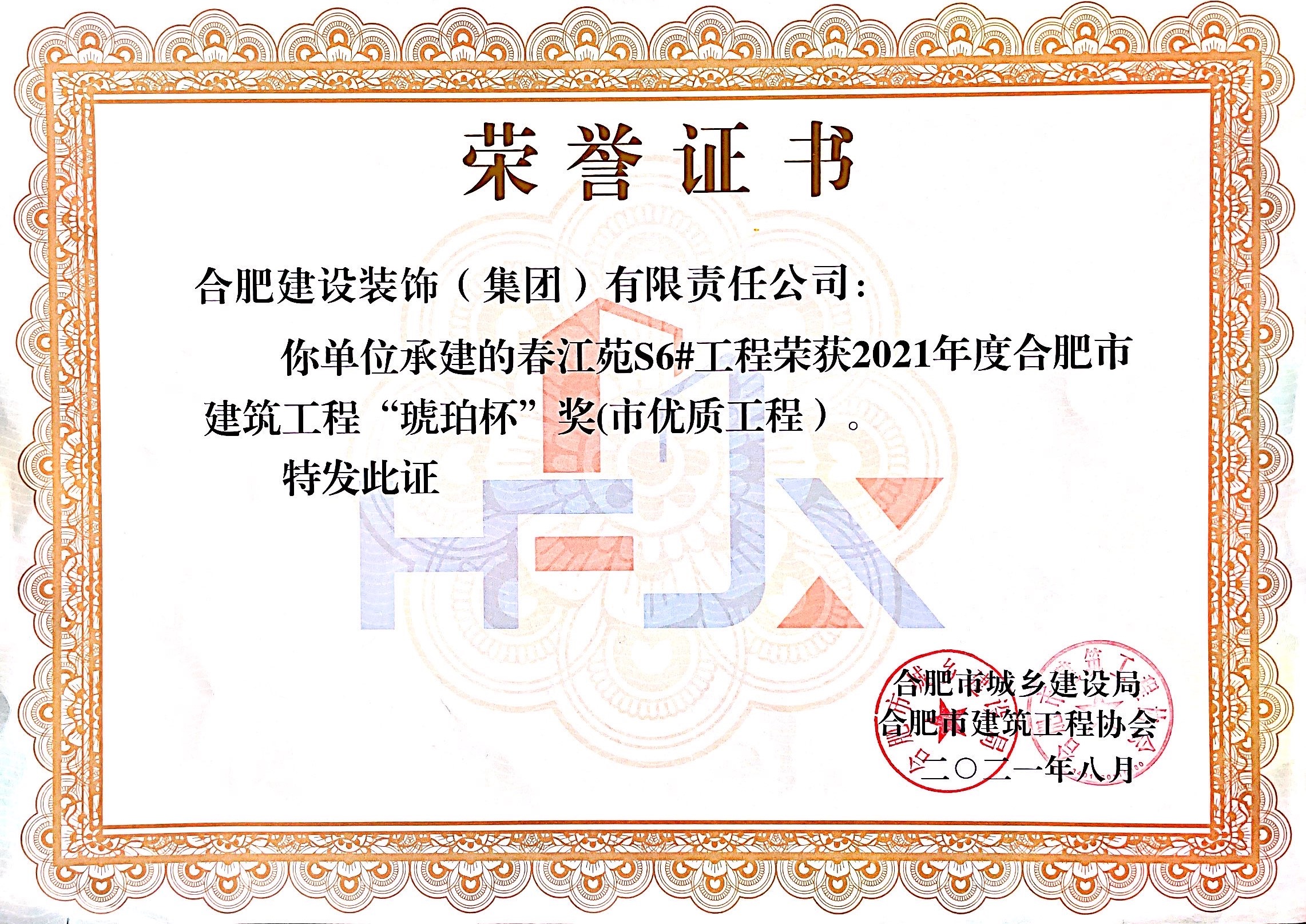 >春江苑S6#--2021年度合肥市建筑工程“琥珀杯”奖(市优质工程)